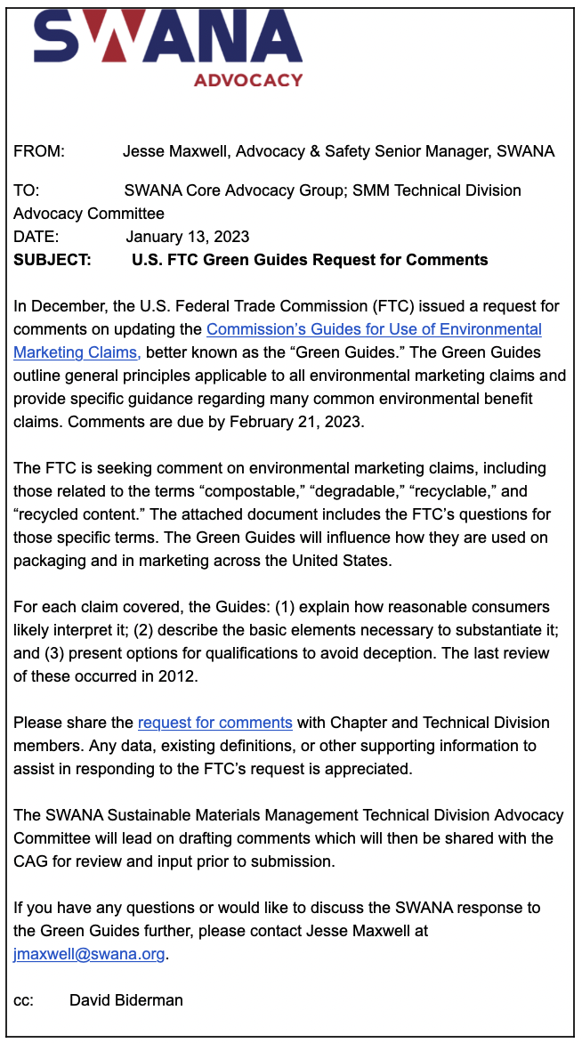In past years, SWANA has signed onto joint comments with the RNG Coalition, NWRA, and others with the approval of the CAG. The RNG Coalition has provided an outline of their comments for this year which are attached and can also be accessed here.