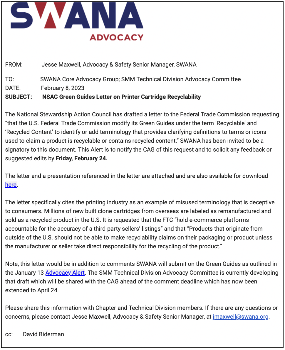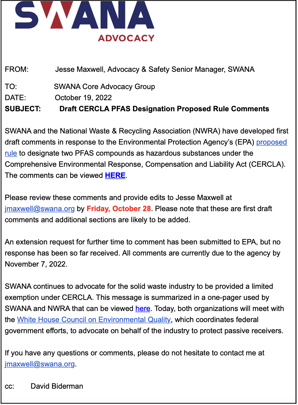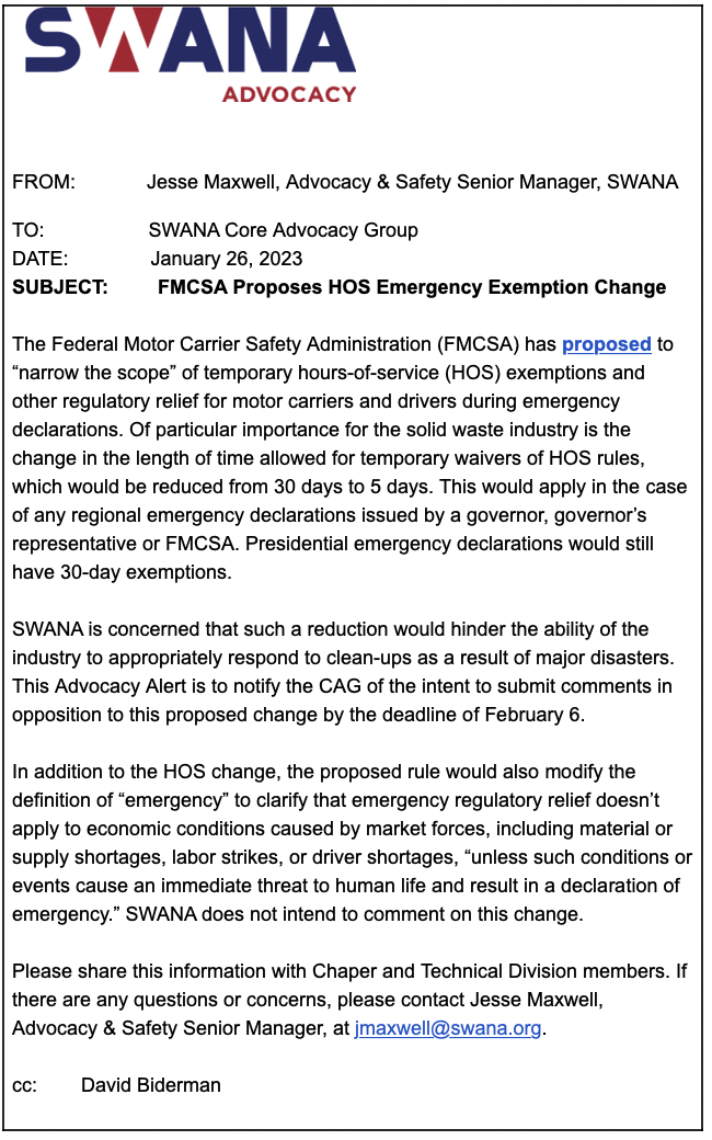 If there are any questions or concerns, please contact Jesse Maxwell, Advocacy & Safety Senior Manager, at jmaxwell@swana.org.