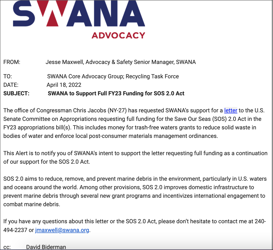 In addition to working with EPA on this issue, SWANA continues to engage with Congress on potential legislative actions that could ensure that passive receivers of PFAS, like landfills and wastewater treatment facilities, can continue to do so safely and economically.