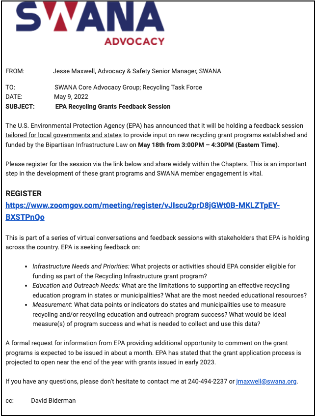 The goal of SWANA National’s advocacy program is to represent the interests of the solid waste profession in the U.S. by being a proactive advocate of environmentally and economically sound solid waste legislation and regulations. The Minnesota chapter provides updates from national to our members as we receive them in our monthly e-newsletter as well as on this website.
