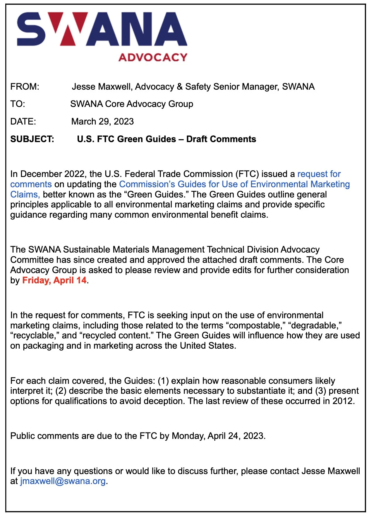FROM: Jesse Maxwell, Advocacy & Safety Senior Manager, SWANA